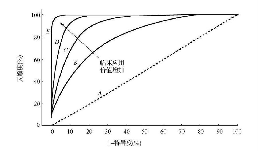 | 一、ROC曲線簡介 1.什么是ROC曲線 ROC曲線即受試者工作特征曲線(receiver operator characteristic curve,ROC),又稱為感受性曲線(sensitivity curve),是反映靈敏度和特異度連續(xù)變量的綜合指標(biāo),通常被用來直觀地確定某一種診斷方法(診斷試劑、診斷設(shè)備)的最優(yōu)診斷界值,即取靈敏度和特異度之和最大的截點(diǎn),盡量靠近曲線左上方的點(diǎn)。也可以用來對同一種疾病兩種以上的診斷方法的臨床應(yīng)用價(jià)值進(jìn)行粗略的比較評價(jià)。 傳統(tǒng)的ROC曲線解決的是“是”或“否”的問題,可以根據(jù)醫(yī)師對讀片結(jié)果類型的不同,分成二分類法和多等級法?紤]到在影像學(xué)中的應(yīng)用,除了判斷是不是病灶,還要考慮病灶所在的位置,以及是單發(fā)病灶還是多發(fā)病灶,需要對病灶進(jìn)行定性、定位、定量診斷,因此衍生出LROC(location-response operating characteristic)、FROC(free-response operating characteristic)、AFROC(alternative FROC)。 2.ROC曲線的繪制 由于醫(yī)師自身的學(xué)習(xí)背景、工作經(jīng)驗(yàn)等多方面存在差異,對影像學(xué)設(shè)備成像的讀片也有自己的尺度,即不同的醫(yī)師會有不同的診斷界值。根據(jù)不同的診斷界值對多幅影像做出診斷,并與金標(biāo)準(zhǔn)相對照,可分別計(jì)算出靈敏度和特異度。根據(jù)診斷界值從低到高取若干個(gè)截?cái)帱c(diǎn)(至少5組),逐個(gè)計(jì)算相應(yīng)的靈敏度(真陽性率)、特異度(真陰性率),以靈敏度為縱坐標(biāo),1-特異度(假陽性率)為橫坐標(biāo),標(biāo)出各工作點(diǎn),然后連接各點(diǎn)繪制而成的曲線。一般情況下,ROC曲線均處于(0,0)和(1,1)連線的上方,選取的工作點(diǎn)越多,曲線越平滑。 3.ROC曲線的應(yīng)用 ROC曲線主要有三方面應(yīng)用。首先,ROC曲線可以直觀地反映診斷方法的靈敏度和特異度;其次,也是最常用的,通過計(jì)算ROC曲線下面積(area under roc curve,AUC),對多個(gè)器械的臨床應(yīng)用價(jià)值進(jìn)行比較,是一個(gè)客觀直觀的指標(biāo)。如下圖的B-E四種影像設(shè)備的ROC曲線,E的AUC最大,臨床應(yīng)用價(jià)值最高。ROC曲線下面積的計(jì)算通常可以采用雙正態(tài)參數(shù)法和非參數(shù)法進(jìn)行計(jì)算,這兩種方法計(jì)算的曲線下面積及其方差十分相近,所以在實(shí)際應(yīng)用中不必過分要求數(shù)據(jù)符合正態(tài)分布。最后,是曲線下部分面積,當(dāng)兩個(gè)器械的ROC曲線并不像圖中那樣,而是出現(xiàn)交叉時(shí),由于曲線下面積不能反映某一范圍內(nèi)的靈敏度與特異度優(yōu)劣,甚至可能會得出相反的結(jié)論,所以利用曲線下部分面積進(jìn)行比較,才能反映真實(shí)情況。 二、ROC曲線在影像學(xué)設(shè)備中的應(yīng)用 ROC曲線在影像學(xué)設(shè)備中應(yīng)用很多。 第一,可以根據(jù)曲線選擇診斷界值,達(dá)到最優(yōu)的靈敏度和特異度,使器械發(fā)揮最佳的效果,也可以通過曲線下面積判斷設(shè)備的成像質(zhì)量,通常0.9及以上的成像效果佳,0.7~0.9成像效果中等,0.5~0.7成像效果較低。這一應(yīng)用多體現(xiàn)在產(chǎn)品生命周期的設(shè)計(jì)開發(fā)階段,如深度學(xué)習(xí)輔助決策AI影像學(xué)軟件在設(shè)計(jì)開發(fā)過程中通過不同診斷界值的選擇,使軟件達(dá)到最優(yōu)的靈敏度特異度組合,發(fā)揮最大臨床應(yīng)用價(jià)值。 第二,是通過AUC來評判器械的變更。如某一影像設(shè)備在做影響到臨床應(yīng)用的許可事項(xiàng)變更時(shí),對于臨床應(yīng)用價(jià)值變化或成像質(zhì)量的判斷,可以通過變更前和變更后的各自AUC進(jìn)行比較。若AUC變大,或變化在科學(xué)合理的范圍內(nèi),則可以判定該許可事項(xiàng)變更臨床應(yīng)用相關(guān)部分是合格的。 第三,對不同影像設(shè)備的成像質(zhì)量進(jìn)行比較。通過計(jì)算AUC的大小,來評價(jià)兩種或多種同類型影像設(shè)備的臨床應(yīng)用價(jià)值的大小或成像質(zhì)量的優(yōu)劣。通過計(jì)算曲線下部分面積,也可以判斷在某一靈敏度、特異度范圍內(nèi)不同影像設(shè)備的臨床應(yīng)用價(jià)值或成像質(zhì)量。 除以上應(yīng)用外,ROC曲線還可以評價(jià)不同診斷醫(yī)師的診斷效能。值得注意的是,在應(yīng)用ROC曲線時(shí),病例的選擇和干擾因素的控制關(guān)系到是否能得到客觀真實(shí)的結(jié)論。 |